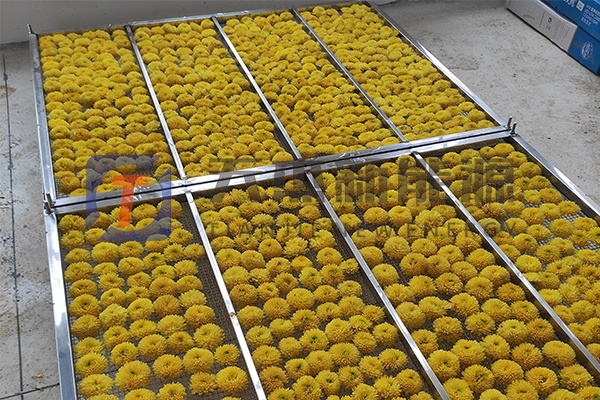 裝房過程中:將采摘好的菊花進行挑揀,選擇花型一致,顏色統(tǒng)一的鮮菊花,均勻擺放在托盤上,如果對花型有要求嚴格的話,則建議在擺放時不要重疊,隨后放置在推車上,推進菊花烘干機內(nèi)。