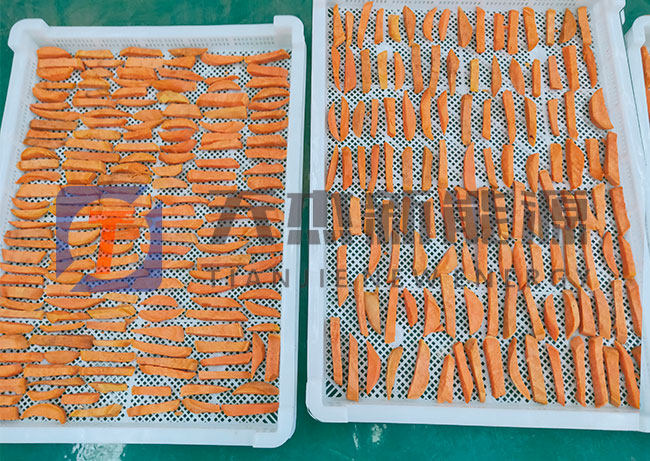紅薯烘干工藝:紅薯烘干加工前需要先將紅薯去皮清洗,然后蒸煮。在有七八分熟的時(shí)候?qū)⑵淙〕觯鋮s,切片或切條、切丁。在切片環(huán)節(jié)中,要保持厚度一致差別別太大,將切好的紅薯均勻整齊的擺放在烘盤上。然后進(jìn)行烘干。紅薯烘干機(jī)需要多久?請看下面介紹。