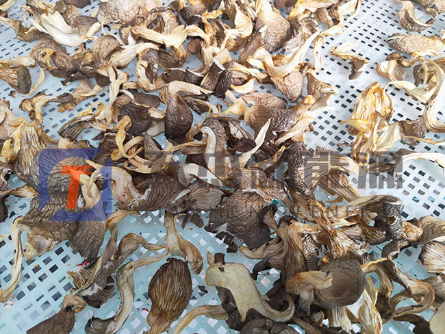 五、蘑菇烘干完好期:這個(gè)時(shí)候的主要目的是除去菇體心部(菇柄與傘部交接處內(nèi)部)的殘留水分和部分結(jié)合水。溫度設(shè)置為58—60℃,烘干時(shí)間1—2小時(shí),進(jìn)排氣孔全部關(guān)閉,回溫孔全部打開,讓熱風(fēng)進(jìn)行內(nèi)循環(huán),不再進(jìn)新風(fēng),循環(huán)風(fēng)量可減到中、小程度,使菇體內(nèi)的酸與酶作用產(chǎn)生香氣。此期結(jié)束時(shí),干蘑菇體內(nèi)含水量為11-13%,達(dá)到貯藏標(biāo)準(zhǔn)或出口標(biāo)準(zhǔn),檢查蘑菇干燥情況,用手指按壓菌蓋與菌抦交界處,并輕掰一下菇抦,能輕易折斷并發(fā)出輕脆的響聲,可以看到菌褶直立,完整,蘑菇保持原有的形狀,菌蓋圓平,表面光滑,色澤金黃,散發(fā)蘑菇特有的鮮香。