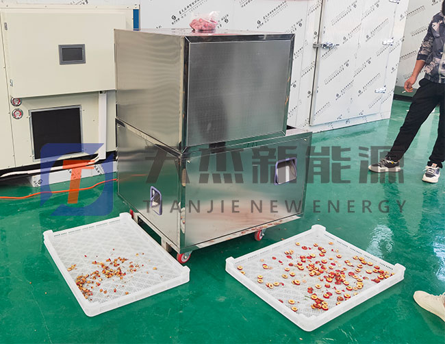 2、護色處理,一般多用0.5%異維生素C溶液浸泡10-15分鐘,防止果片變色并盡快瀝干水分,均勻放入山楂烘干機設備物料車內(nèi),注意平鋪厚度不宜過厚。