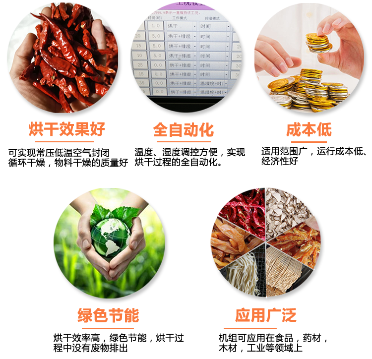 熱泵烘干機(jī)烘干出來(lái)的物料效果好,可實(shí)現(xiàn)常壓低溫空氣封閉循環(huán)干燥,物料干燥的質(zhì)量好。全自動(dòng)化,烘干過(guò)程中的溫度濕度調(diào)控方便,實(shí)現(xiàn)烘干過(guò)程的全自動(dòng)化。一機(jī)多用,適用范圍廣,運(yùn)行成本低,經(jīng)濟(jì)性好。烘干過(guò)程中沒(méi)有廢物排出,綠色節(jié)能,烘干效率高。熱泵烘干機(jī)可應(yīng)用在食品,藥材,木材,工業(yè)等領(lǐng)域上。歡迎您聯(lián)系我們了解中藥材烘干機(jī)、辣椒烘干機(jī)、香菇烘干機(jī)、金銀花烘干機(jī)等更多產(chǎn)品。
